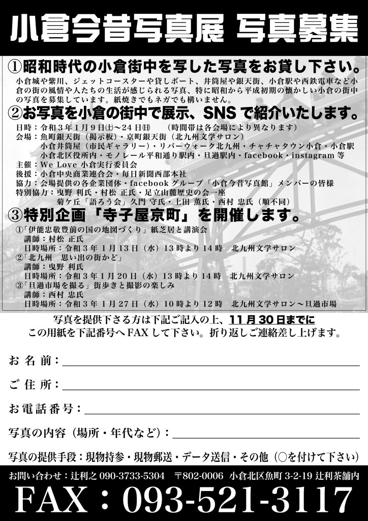 ・そんな仕事の一環として来年正月に「小倉今昔写真展」が開催されます。小倉の古い写真を集めて展示します。もちろん私が撮ったものではありませんが、新聞社を始め、一般の方々から古い写真を拝借して、それぞれに修復を施して展示する予定です。先日21日の毎日新聞朝刊でも紹介されました。